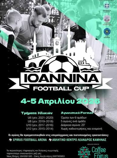 Ioannina Football Cup 2026 4–5 Απριλίου 2026 | Ιωάννινα ΜΕΓΑΣ ΧΟΡΗΓΟΣ COFFEE EPIRUS Ένα αναπτυξιακό τουρνουά ποδοσφαίρου που φιλοδοξεί να καθιερωθεί ως θεσμός, προσφέροντας στους μικρούς αθλητές παιχνίδι, εμπειρίες και χαμόγελα Αγώνες σε σύγχρονες και πιστοποιημένες εγκαταστάσεις: Epirus Football Arena & Αθλητικό Κέντρο Λέανδρος Καμήνας Αγωνιστικό format χωρίς αναμονή Όμιλοι Συνεχόμενα παιχνίδια Έμφαση στη χαρά, τη συμμετοχή & το fair play Ηλικιακά τμήματα: U6 | U8 | U10 | U12 Ποδόσφαιρο στην καρδιά της Ηπείρου, δίπλα στη λίμνη Παμβώτιδα και το ιστορικό Κάστρο των Ιωαννίνων. Υπό την αιγίδα της Περιφέρειας Ηπείρου, του Δήμου Ιωαννιτών και της ΕΠΣ Ηπείρου Διοργανωτές: Atlas Epirus F.C. Academy & Α.Ο. Σταυρακιου 2009 Οι συμμετοχές έχουν ανοίξει – οι θέσεις είναι περιορισμένες! 6940 501085 | 699 7065853 ioanninafootballcup@gmail.com #IoanninaFootballCup #YouthFootball #AtlasFC #EPSEpirus #FootballTournament Ioannina