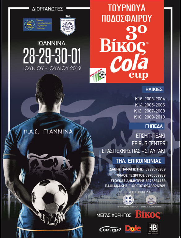 Η Ε.Π.Σ. ΗΠΕΙΡΟΥ σε συνεργασία με την Π.Α.Ε. ΠΑΣ ΓΙΑΝΝΙΝΑ ανακοινώνουν τη διοργάνωση Τουρνουά Ποδοσφαίρου αναπτυξιακών ηλικιών με την ονομασία “3ο Βίκος Cola CUP” το διάστημα 28/06 έως 01/07/2019.
